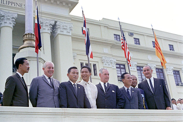 The leaders of some of the SEATO countries in front of the Congress building in Manila, hosted by Philippine President Ferdinand Marcos on October 24, 1966. Left to Right: Prime Minister Nguyen Cao Ky (South Vietnam), Prime Minister Harold Holt (Australia), President Park Chung Hee (South Korea), President Marcos, Prime Minister Keith Holyoake (New Zealand), Lt. Gen. Nguyen Van Thieu (South Vietnam), Prime Minister Thanom Kittikachorn (Thailand), and President Lyndon B. Johnson (United States). South Vietnam was not a member of SEATO.