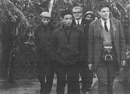Staughton Lynd near the city of Nam Dinh inspecting U.S. bombing damage during his ten-day trip to North Vietnam (December 1965-January 1966). Foreground (Left to Right): Do Xuan Oanh, interpreter and member of Vietnam Peace Committee, and Staughton Lynd. Background: unidentified Vietnamese guide with American historian Herbert Aptheker. Photograph by the courtesy of Staughton and Alice Lynd.