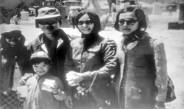 At Camp Pendleton refugee camp in California in April 1975: My aunt My Trang (left), my father Huan at seven years old (front), my grandfather Sum Vo (rear), aunt My Ngoc (second from right), and my grandmother Giahuan (right).