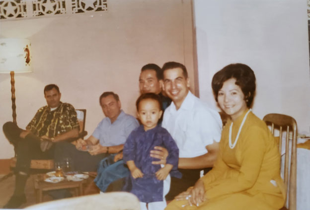 Celebrating Tet (Lunar New Year) in February 1971 in Saigon: My father Huan Vo-Ta at three years old (left front), my grandfather Sum Vo (left rear), U.S. Navy Commander Joseph Fenick (middle in white), and my grandmother Giahuan (right).